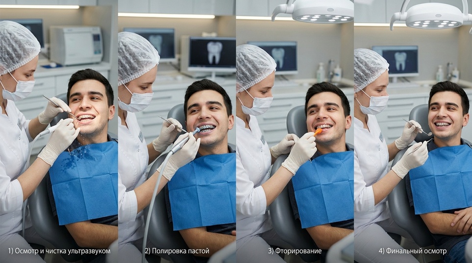 Процедура профессиональной чистки в ортодонтических случаях проходит в несколько последовательных шагов, адаптированных под наличие брекет-системы. Сначала врач осматривает конструкцию на предмет ослабления элементов, используя зеркало и зонд. Это позволяет избежать случайных повреждений во время основной обработки.