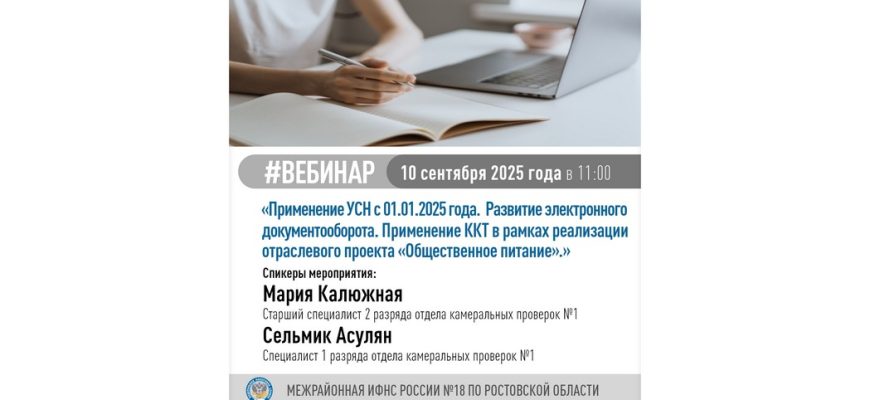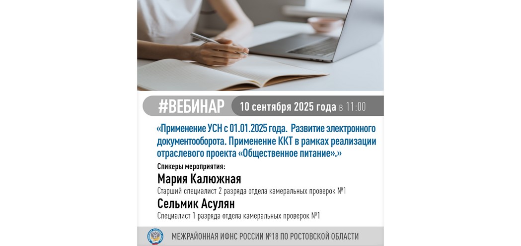 Приглашаем налогоплательщиков принять участие в вебинаре по теме «Применение УСН с 01.01.2025 года. Развитие электронного документооборота. Применение ККТ в рамках реализации отраслевого проекта «Общественное питание»».