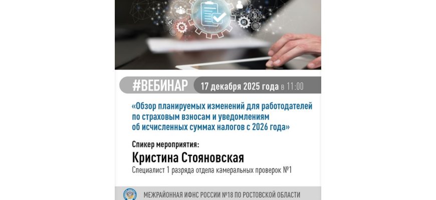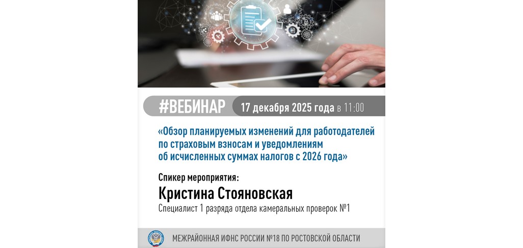 Приглашаем налогоплательщиков принять участие в вебинаре по теме «Обзор планируемых изменений для работодателей по страховым взносам и уведомлениям об исчисленных суммах налогов с 2026 года»