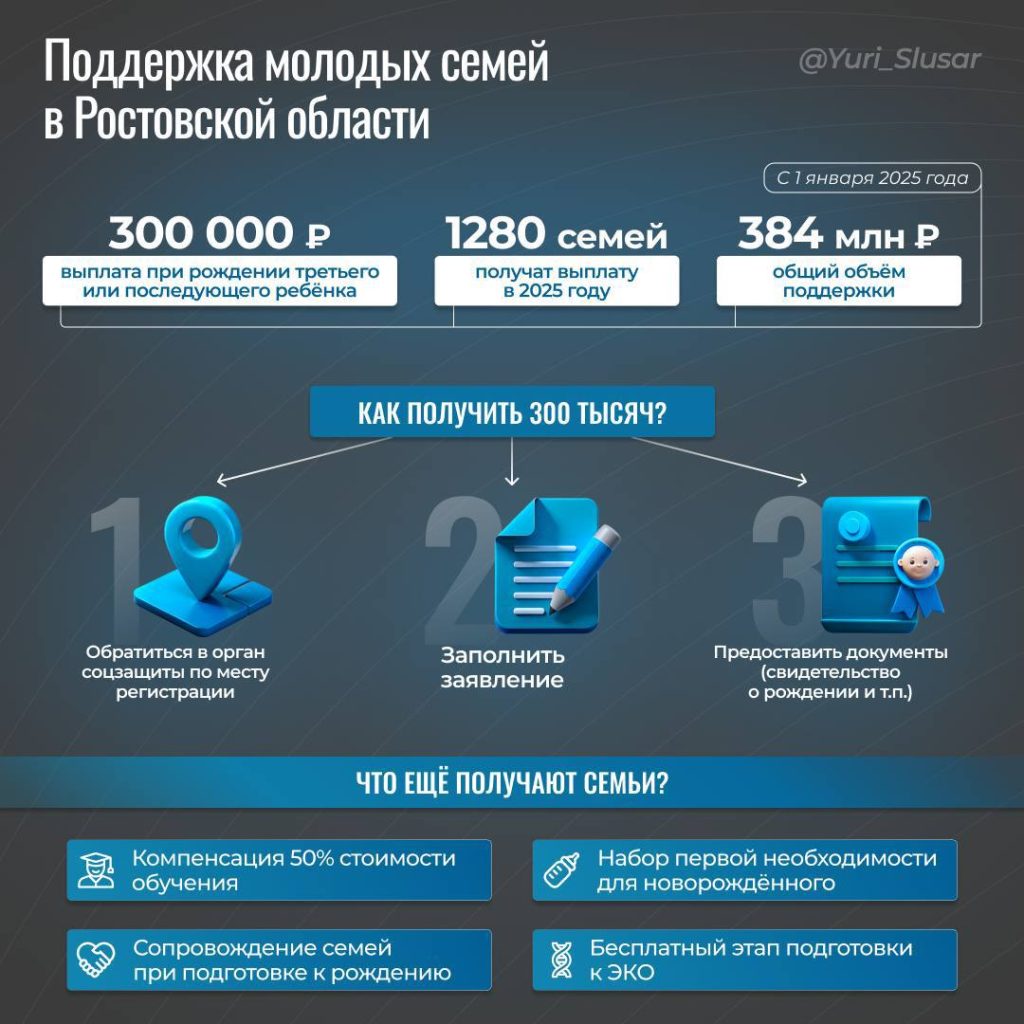 «Поддержка семьи — наш приоритет. Мы делаем всё, чтобы ростовские семьи чувствовали заботу государства и могли комфортно планировать своё будущее», – сообщил в своем телеграм-канале Юрий Слюсарь.