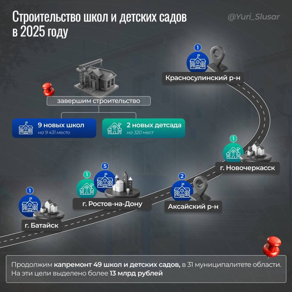 «В 2025 году завершим строительство 2 детских садов на 320 мест в Новочеркасске и Ростове. Достроим 9 школ в Ростове и Батайске, Аксайском и Красносулинском районах, а это почти 10 тысяч новых мест для наших детей», – сообщил глава донского региона в своем телеграм-канале.