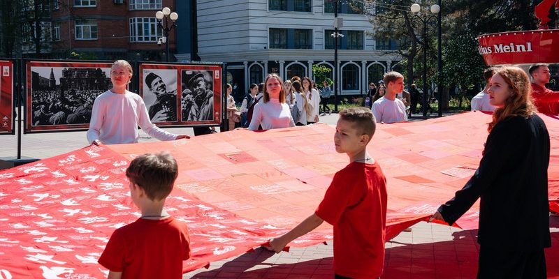 Центральным событием стало развертывание 300-метрового полотна у Донской публичной библиотеки. Всего в муниципалитетах области собрали 55 отдельных знамен с именами героев. Если объединить их в одно, получится полотно длиной 2,5 км и высотой 3 метра.