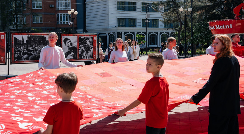 В Ростовской области прошла масштабная патриотическая акция «Полотно Победы» с участием 35 тысяч дончан в годовщину водружения Знамени Победы над Рейхстагом в Берлине.
